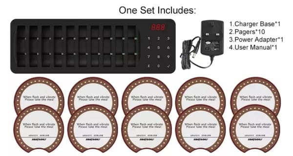 The System Includes: Coaster Pagers, Charging Base&Keypad, Power Adaptor, and User Manual.